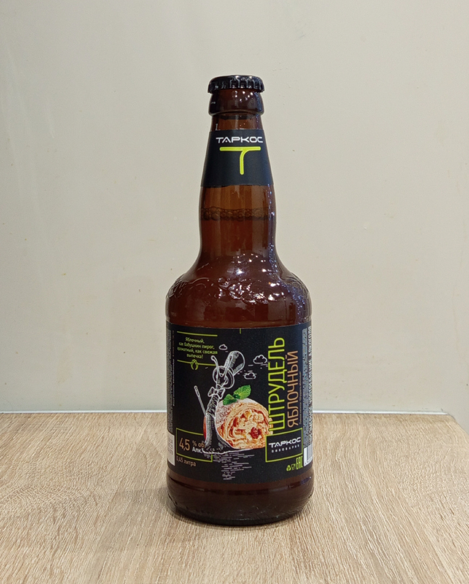 Аккурат 1 Января, после хорошей прогулки по снежному, зимнему лесу, забрел я в местный продуктовый, в котором хорошо представлена всем известная воронежская пивоварня Таркос. Есть у воронежцев несколько позиций, которые часто встречаются в продаже, но которые я ещё не пробовал. Все это, так скажем, вкусовое пиво. Одно из них «Яблочный Штрудель» показался мне отличным вариантом, чтобы совместить пиво и новогодние праздники. Почему-то тема яблочного пирога в какой-то степени ассоциируется у меня с новогодней тематикой. В реале же это фрутбир, без каких-либо специй в составе. Описание пива, впрочем, скажет за него более точно: Пивной штрудель — классический европейский рецепт, в котором в тесто добавляют пиво, а не воду или молоко. Такая выпечка получается особенно нежной и пышной. Мы вдохновились этим рецептом и решили пойти дальше — добавить яблочный штрудель в наше пиво! Фруктовый эль со вкусом и ароматом свежей яблочной выпечки. Эффект достигается сочетанием пшеничного и ячменного с