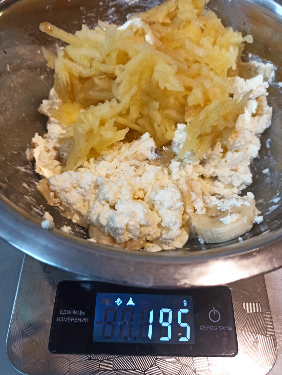 Мне Знакомая рассказала, что делает сырники без муки и манки, а вместо этого кладёт банан и тертое яблоко. Хм. Пробую новый рецепт. Творог, 2 яйца, банан нарезала кружочками, яблоки на крупной терке, соль. Всё перемешала. Разложила в силиконовые формы и на 35 минут в духовку. На выходе получилось 9 очень сочных вкусных сырников, совершенно не такие, как на сковороде, больше похоже как будто на пару приготовлены. Вкусно, но, если б не формы - развалились бы. Так что, либо нужно банан измельчать в пюре, либо муку или манку добавлять. Калорийность приятная и оптимистичная. Ещё творожок с "морковкой" и кофеёк с молоком. Вполне. Убираю в закрома в морозилку.
