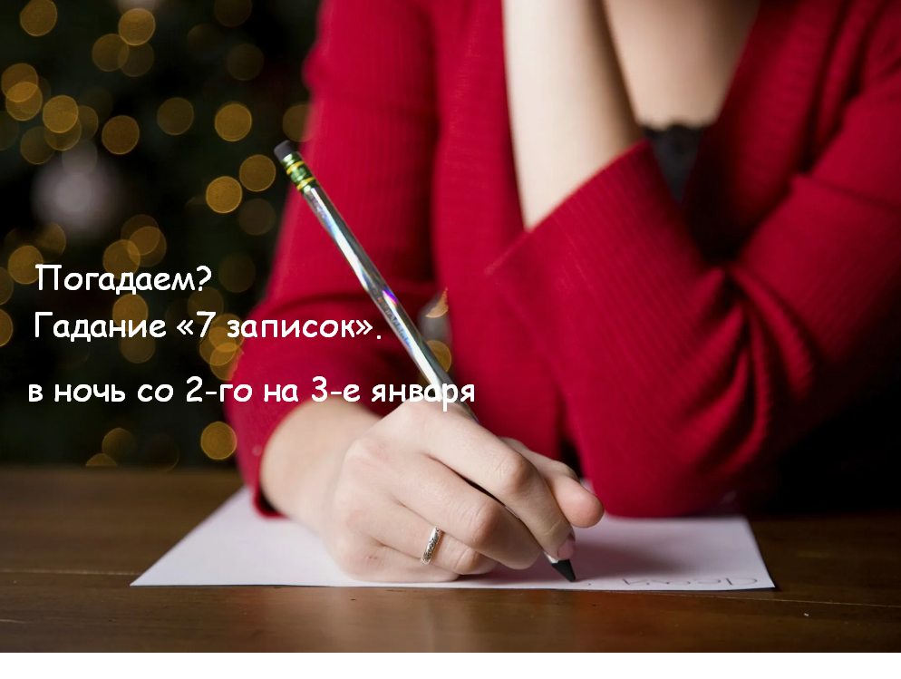 Гадание работает только 3 января Заготовьте с вечера 7 одинаковых кусочков бумаги и напишите на них следующее: 1 – правая рука 2 – левая рука 3 – сердце 4 – голова 5 – правая нога 6 – левая нога 7 – живот Все бумажки сверните и положите на ночь под свою подушку. Утром, лежа, не опуская ног на пол, выньте одну из бумажек и прочтите то, что вас ждет. Правая рука – вас ждет прибыль. Левая рука – покупки, траты. Сердце – любовь, отношения. Голова – найдете решение. Правая нога – карьерный рост. Левая нога – встреча с тем, кто вам дорог. Живот – позаботьтесь о своем здоровье.