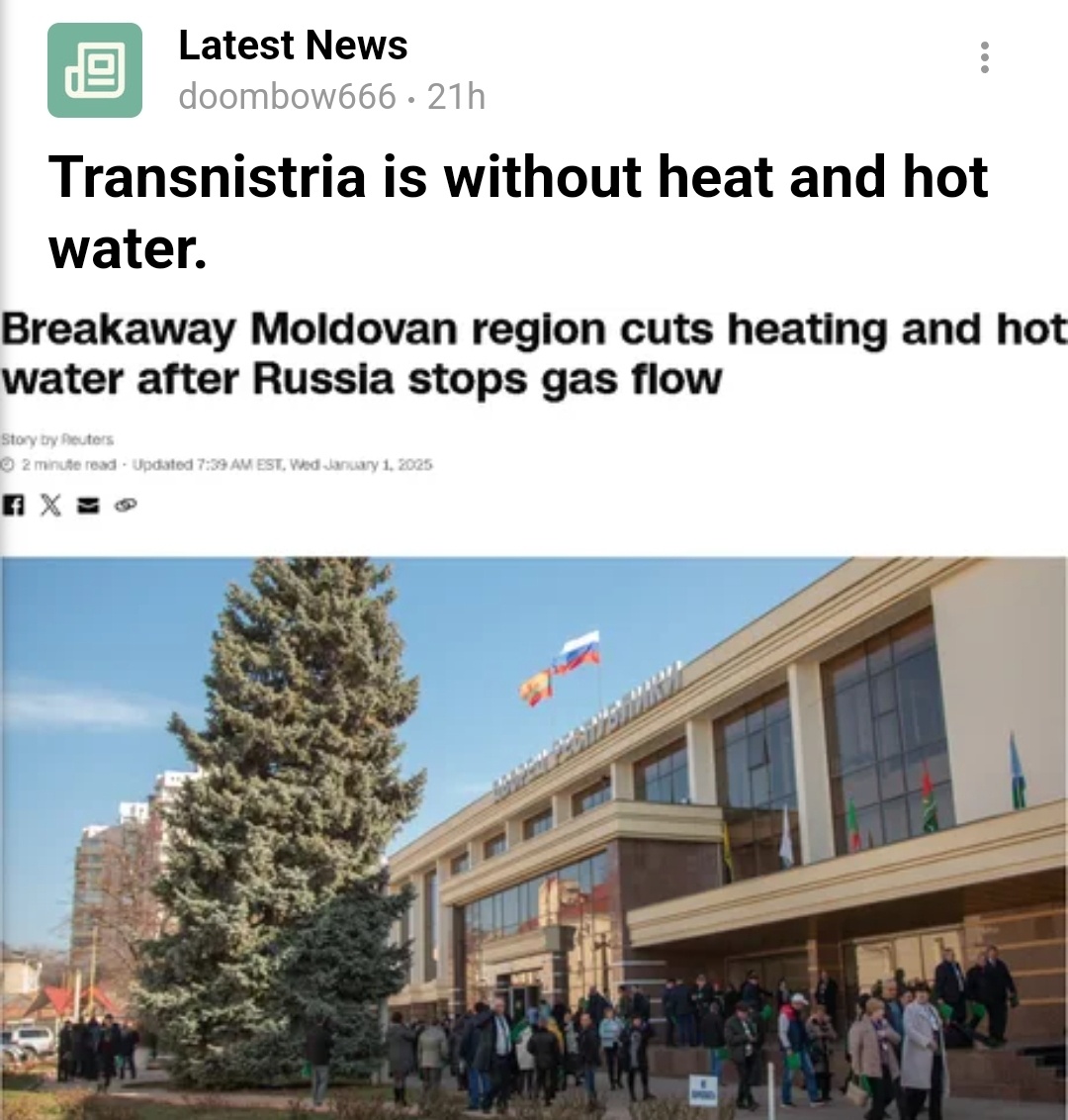 Все промышленные предприятия Приднестровья прекратили работу из-за отсутствия энергоресурсов. Месяц назад премьер-министр Молдавии Дорин Речан выступил против выплаты «Газпрому» долга в размере $ 709 миллионов. Он назвал долг «несуществующим». «Мы не собираемся оплачивать эту задолженность». Ну и реакция толерантной и посвящённой публики. войтасто Оккупированный регион Молдовы. большеменьше 🇩🇪 Через несколько часов их «спросят», «пророссийские» они сейчас или нет. В противном случае некоторых из них придется «освободить». Я уверен, что демократические эксперты в Кремле предлагают этой стране заморозить или установить дружественное России правительство, Трансназальную-Дружбу или как там эта партия называется... С простой винтовкой за спиной, граждане наслаждаются российскими «референдумами»... Затем будет создана сказка о том, что один парень был лучшим другом собаки Адольфа и так далее. Через 20 лет те же придурки из болота попытаются убедить нас, что с этой войной она станет такой