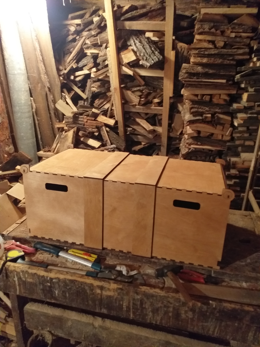 Пример коробок с поворотными крышками, общей длиной около 90 см, сделанные на рабочем поле 60х40 из 6 мм фанеры. Для того чтобы зарабатывать не обязательно вбухивать 300 тысяч на станок с приличным полем. Голова важнее поля.