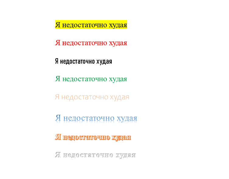 Разделение с мешающими мыслями — это важный навык, который необходимо развивать. Когда вы поймете, что вас зацепило самоограничивающее убеждение, или неприятное самоосуждение, или тревожная мысль о будущем, или болезненная мысль о прошлом, найдите минутку, чтобы разделиться с ними. Цель этих упражнений не в том, чтобы бросить вызов истинности мыслей, а в том, чтобы увидеть их истинную природу: увидеть, что они являются не чем иным, как словами. Иногда эти слова могут быть полезны, а иногда нет. Начните с того, что вспомните негативное самоосуждение и сформулируйте его в коротком предложении, например: «Я непривлекательный» или «Я недостаточно худая». (Почему эти мысли мешают, а не помогают, много рассказываю на канале) Теперь представьте это как простой черный текст строчными буквами на экране компьютера (Если у вас есть доступ к компьютеру это упражнение будет более эффективным, но можете и просто воображать). Теперь поиграйте с форматированием. Я н е д о с т а