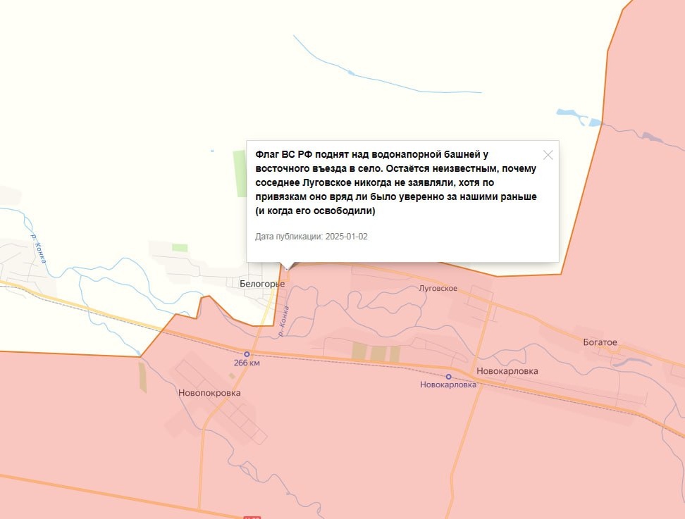 По состоянию на 2 января, ВС РФ успешно наступает под Покровском и заканчивает освобождение Курахово. Фронт в районе Малой Токмачки активизировался внезапно. Флаг у восточного въезда в Белогорье водрузили бойцы 70-го мотострелкового полка. А после выполнения задачи разведчики от