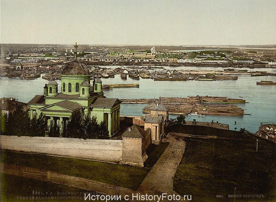 Благовещенский монастырь в Нижнем Новгороде — древнейший монастырь, заложенный в начале XIII века основателем Нижнего Новгорода князем Георгием Всеволодовичем. Расположен в Нижегородском районе, на правом берегу Оки недалеко от её впадения в Волгу. Фотохромная открытка Российской империи в конце 19-го – начале 20-го века.