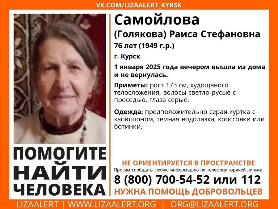 Волонтеры поискового отряда «Лиза Алерт Курская область» отправились на поиски 76-летней Раисы Самойловой. Сообщается, что пожилая курянка вышла из дома в районе улицы 50 лет Октября вечером 1 января и до сих пор не вернулась. Уточняется, что женщина не ориентируется в пространстве. Сегодня днем волонтеры организовали поисковый сбор. Новостей о том, что пенсионерка найдена, до сих пор нет. Приметы пропавшей: рост 173 см, худощавого телосложения, волосы светло-русые с проседью, глаза серые. Предположительно она была одета в серую куртку с капюшоном, темную водолазку, кроссовки или ботинки. Информацию о женщине можно сообщить по бесплатному единому номеру «Лиза Алерт» 8(800)700-54-52 или по телефону 112. Антон ФИЛИППОВ, фото Лиза Алерт Курская область Постоянный адрес новости на сайте «Друг для друга» ~ https://dddkursk.ru/lenta/2025/01/02/114970/. Новости Курска за ~ 2 января ~ январь 2025 года.