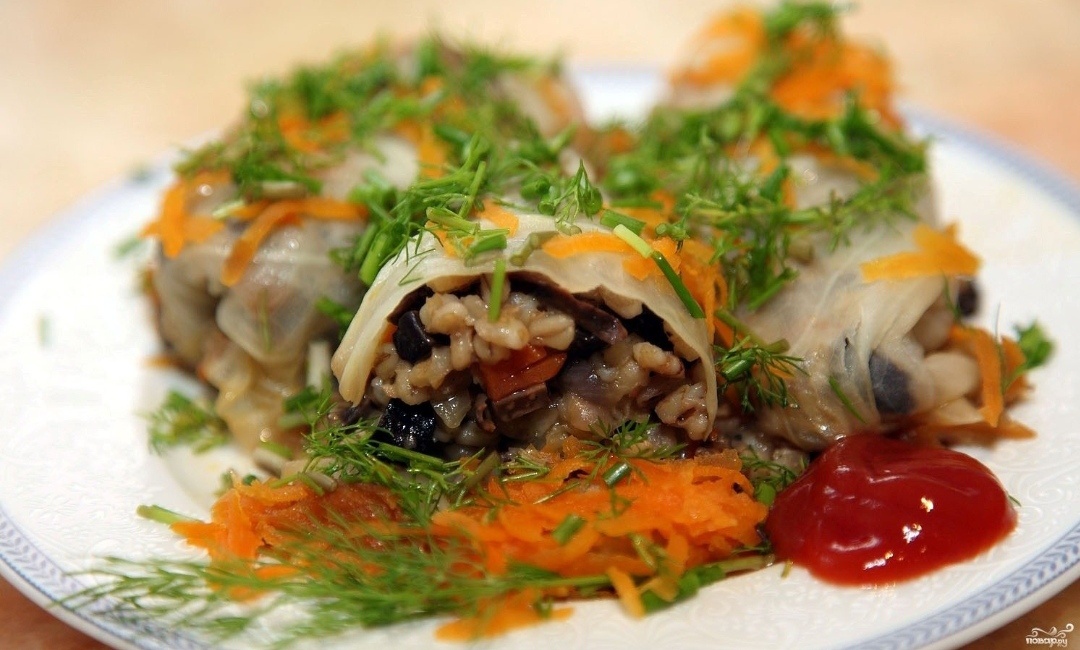 Добрый день! Сегодня для вас постные рецепты от шеф-повара Олега Ольхова Постные голубцы с рисом и грибами маленький кочан капусты - 1 шт., рис - 150 г, шампиньоны (или другие грибы) - 400 г, репчатый лук - 1 шт., морковь 1 шт., укроп - 20 г , соль, перец чëрный молотый Для соуса: Протëртые томаты в собственном соку - 500 мл, соль, перец чëрный молотый Капусту разобрать на листья, опустить в солëный кипяток на 3-5 мин. Листья охладить, срезать утолщения. Рис сварить почти до готовности. Грибы нарезать мелкими кубиками, лук нарезать мелкими кубиками, морковь натереть на мелкой тёрке, спассеровать лук, морковь и грибы на растительном масле, добавить рис, обжарить вместе, посолить и поперчить по вкусу. Свернуть с получившейся начинкой голубцы, уложить в глубокую посуду, залить протертыми томатами, тушить в духовке 15 - 20 мин. при 160С. Или тушить в кастрюле на плите до готовности. При подаче посыпать рубленым укропом Вареники с картошкой и грибами Мука пшеничная в.с - 550 г, во