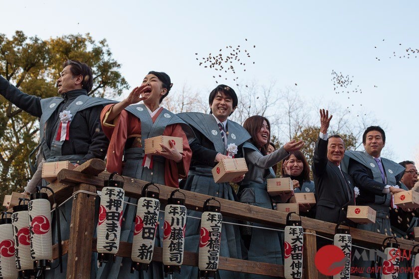 В начале февраля в Японии отмечают праздник Сэцубун. Само это слово (яп. — 節分) означает разделение сезонов. Но особенно празднуется именно наступление весны, ведь это пора обновления природы и начала сельскохозяйственных работ. Раз смена сезонов, соответственно, меняются украшения, расцветки кимоно. Девушки украшают традиционные прически особыми кандзаши: с бумажными вертушками и шариками-кусудама. С древности считается, что время смены сезонов очень уязвимое, начинают проявляться разные злые силы, приносящие неурожай, болезни и другие несчастья. А потому основу праздника составляет обряд изгнания демонов (鬼 — óни). Одна из легенд гласит, что во времена императора Уда (888 — 896) в городе появился злой дух, сошедший с горы Курама. Чтобы изгнать его, семеро ученых монахов молились в течение 7749 дней, а затем откупились от него бобами. Вот с тех пор изгоняют Они жареными бобами, обряд так и называется — 豆撒き (мамэмаки) — «разбрасывание бобов». Бобы раскидывают в доме, особенно в темн