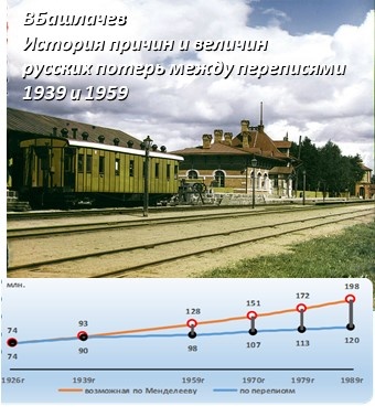 Возможная численность России 1959 года при приросте 1,6% — 128 млн. Возможный прирост между переписями 1939 и 1959 — 35 млн. По переписи 1959 численность русских РСФСР — 98 млн. Фактический прирост переписями 1939 и 1959 7,6 млн. Разница между возможным и фактическим приростом — 27 млн. Это и есть потери русских РСФСР между переписями 1959 и 1970.