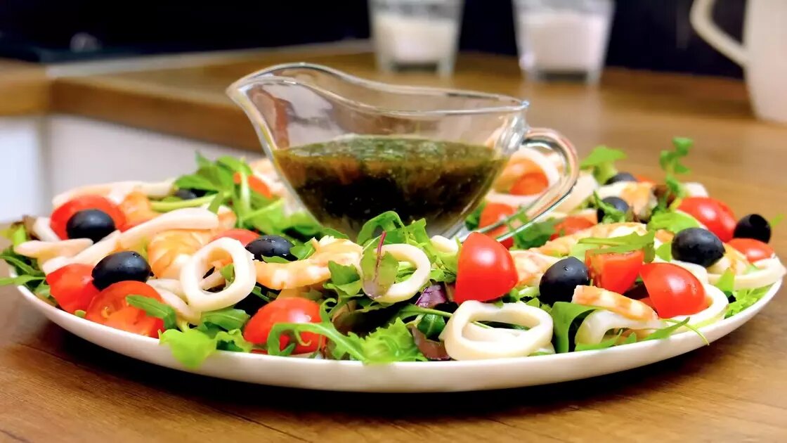 Замороженные кальмары перед приготовлением стоит разморозить, оставив на полке холодильника. С размороженных кальмаров снимают пленку, вычищают внутренности и тщательно моют. Затем опускают в кипящую подсоленную воду с лавровым листом и варят в течение 1 минуты. Замороженные креветки размораживают в холодной воде. Воду рекомендуется менять каждые 5 минут до полной разморозки креветок. Теплую воду для разморозки использовать категорически нельзя, чтобы их мясо не стало резиновым. Достаточно получаса для разморозки даже для самых крупных особей. После охлаждения с них снимают панцирь, очищают от кишечного тракта и варят в течение 3 минут. К очищенным и разрезанным на кружочки кальмарам с креветками добавляют маслины, половинки томатов чери и листья салата. Для заправки смешиваем измельченный чеснок, зелень петрушки, выжатый лимонный сок, растительное масло холодного отжима, соевый соус и даем настояться. Ингридиенты: l 150 г очищенных и отваренных креветок; l 200 г очищенных и отваренны