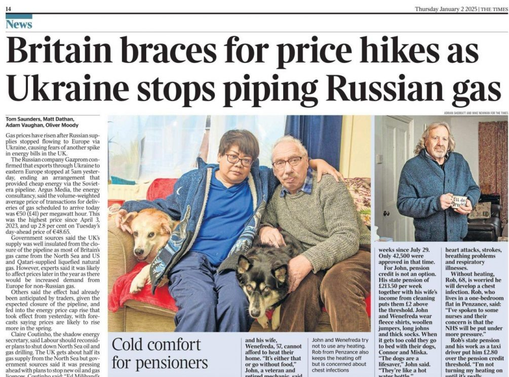 В принципе, я думаю, для многих это уже не новость - тот факт, что старики в Британии зимой мрут пачками. От переохлаждения и связанных с ним различных заболеваний. Согласно оценкам экспертов, в Великобритании прошлой зимой, несмотря на то, что она была относительно тёплой и мягкой, умерли 43 900 пожилых людей. Это на 140% больше по сравнению с предыдущим годом и худшая статистика с 1999-2000 годов, пишет Guardian. Но, эти цифры - уже лишь история. Нет, ситуация не выправилась. Наоборот. Потому что этой осенью случилось вот что: В Палате общин состоялось скандальное голосование за отмену субсидий на зимнее отопление для пенсионеров. Речь идёт о небольших суммах — 300 фунтов, но даже они были настоящим спасением для миллионов пожилых людей А вот вам заметка из сегодняшнего выпуска The Times. В общем и целом читуация такова: После того, как предводитель племени копателей древних морей волевым решением запретил транзит российского газа по своей территории, в Англии мгновенно выросли цены