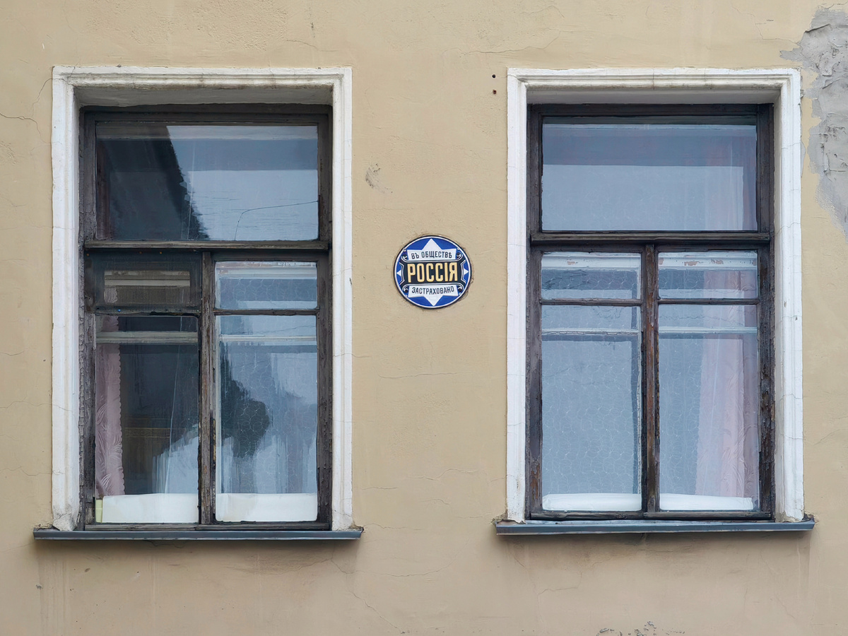 Около месяца назад в группе Вконтакте "Россия. Модель для сборки" я увидел пост о старой табличке страхового общества Россия, которая находится на фасаде здания у метро Петроградская. Сегодня решил сходить и посмотреть на неё своими глазами. Сначала решил, что её повесил на здание местный житель. Очень высоко - на уровне второго этажа, рядом со своим окном. Но, почитав интернет ("Фонтанку"), узнал, что табличка там была всегда - она историческая. Просто находилась под слоем краски, поэтому никто её не замечал. На яндекс.картах от 2023 года она видна (фотографировали не табличку - это просто фрагмент большой фотографии двора). В августе 2024 года группа волонтёров "ГЭНГ" сняли и очистили артефакт. После чего вернули на место. Так ещё одной достопримечательностью Петербурга стало больше - в визуальном плане точно. Как пишет "Фонтанка", цвета у знака страхового общества Россия подлинные - их обнаружили во время расчистки. Табличку раскрасили так как было исторически. Текст гласит: "ВЪ ОБЩ