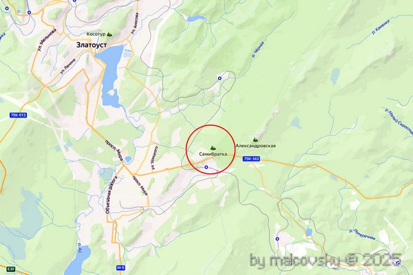 Урочище Семибратка - группа скалистых останцев в юго-восточной части национального парка "Таганай", которые в народном фольклоре прозвали "братьями". Цепочка останцев тянется примерно на километр с севера на юг у границы национального парка. Синим цветом приблизительно показан наш пеший маршрут, а красными кружками отмечены смотровые площадки.