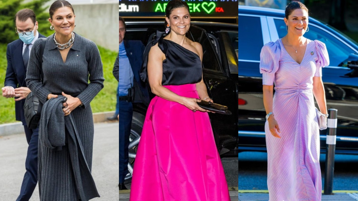 Принцесса Виктория выбрала совершенно потрясающий образ для празднования 100-летия Шведских студенческих союзов в Стокгольмской ратуше, состоящий из топа на одно плечо от шведского бренда Vesna W, юбки из экологичной линии H&M и туфель Gianvito Rossi цвета фуксии...