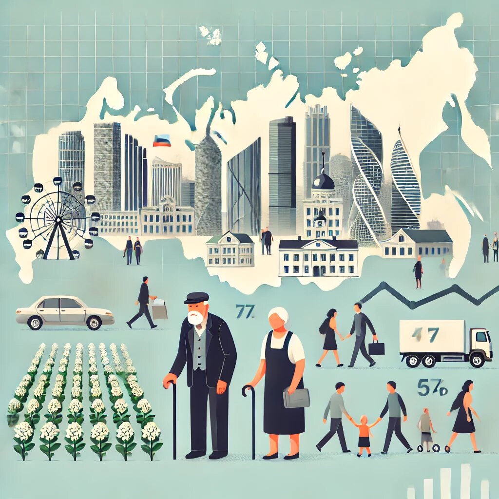 Демографические факторы играют ключевую роль в формировании долгосрочных экономических трендов. Такие аспекты, как старение населения, миграция и урбанизация, оказывают значительное влияние на экономику стран. В данной статье эти аспекты будут рассмотрены на основе анализа статистики Российской Федерации, предоставленной в бюллетене на 2024 год. Согласно данным, представленным в бюллетене, численность населения России составляет 146 424 153 человека. При этом наблюдаются существенные различия в распределении между городским и сельским населением: Это подтверждает высокий уровень урбанизации в стране. Урбанизация способствует экономическому росту за счет концентрации ресурсов и человеческого капитала, однако создает вызовы для сельских регионов, такие как дефицит рабочей силы и замедление развития. Как и в других развитых странах, в России наблюдается процесс старения населения. Доля людей старше 60 лет составляет 24,6% от общей численности населения, что представляет серьёзный вызов д