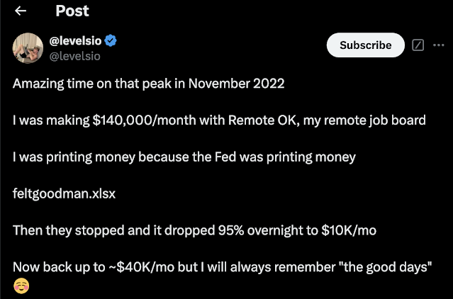 Этот твит Питера Левелса проходит проверку на прочность относительно состояния рынка удаленной работы — что-то вроде 90%-ного спада вакансий удаленной работы по сравнению с пиковым периодом удаленной работы в 2021–2022 годах.