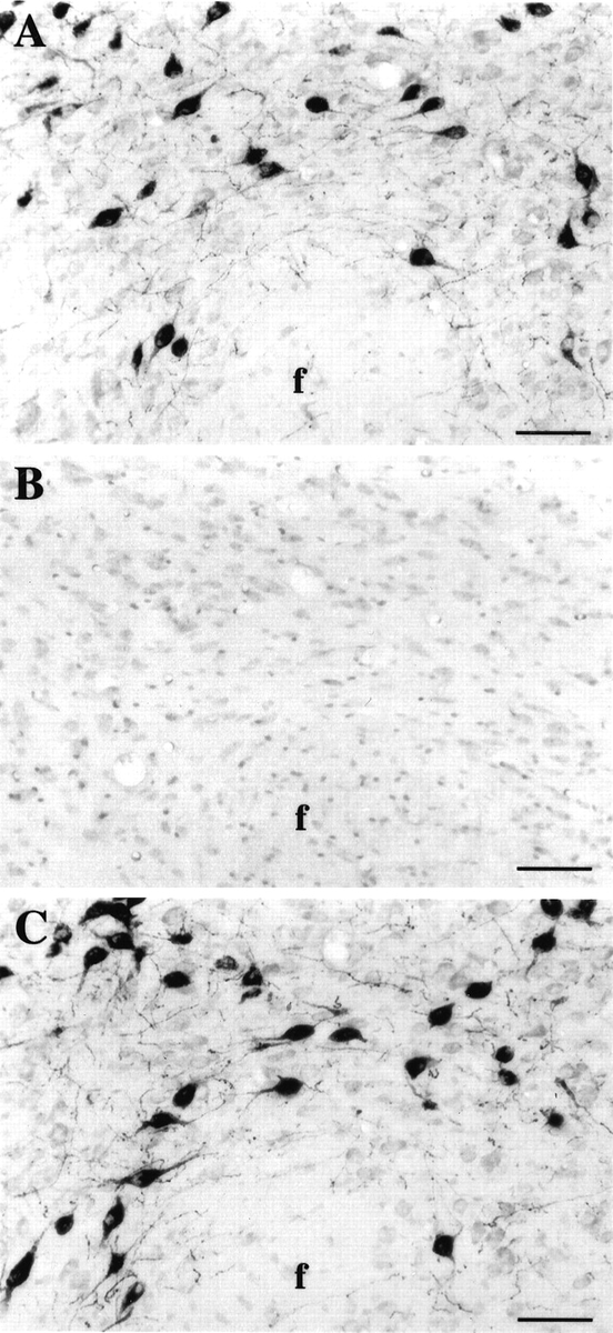 Микрофотографии смежных фронтальных срезов, контрастно окрашенных нейтральным красным на уровне перифорникального ядра гипоталамуса. A, Нейроны Hcrt были помечены с помощью антисыворотки № 2050 против С-концевой 17-аминокислотной части препропротеина. B, Иммунореактивность гипокретина отсутствовала после преинкубации антисыворотки № 2050 с целым препропротеином, что показывает, что это антитело специфически распознает hcrt. C, Нейроны Hcrt были помечены антителом № 2123.