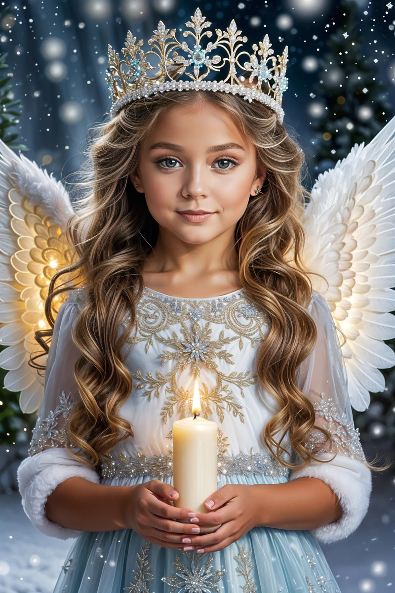 Маленький рождественский ангел, замысловатая детализация, романтическая, красивая маленькая девочка-ангелочек с небес с симметричными крыльями, тиарой и цветами в длинных цветных волнистых волосах, держащая единственную свечу, освещающую ее лицо, очень подробные, замысловатые детали, снежный фон, снежинки , резкий фокус, динамичная поза, высокодетализированное лицо, динамическая подсветка, идеальные пропорции, длинное малиновое зимнее платье и накидка, резкий фокус, сюрреалистический, красиво прорисованный, восстановление лица