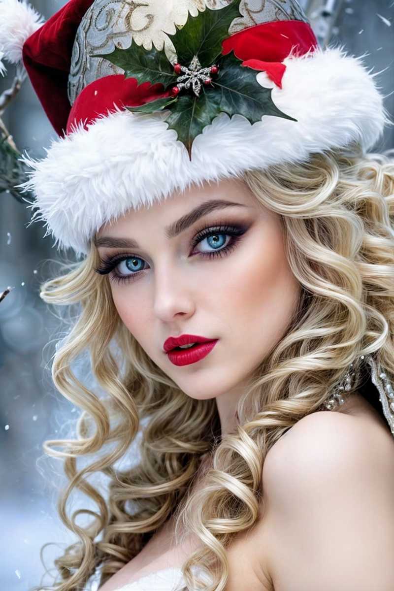 Ультра идеальная праздничная женщина, искусство Шерил Грисбах и Жасмин Бекет Гриффит, Луис Ройо, снежная птица, полное стройное тело, Ультра идеальные руки, Ультра идеальные глаза и естественный макияж, Ультра идеальные длинные светлые вьющиеся волосы, Рождественская шляпа, ультра HDдетализация живопись, Реалистичное искусство, юная леди Белоснежка, красивый глаз, высокая детализация, уникальная, сложная деталь, цифровое изображение, 8k, без тени, изолировано на белом фоне, стиль Жана-Батиста Монжа, яркий, красивый, всплеск