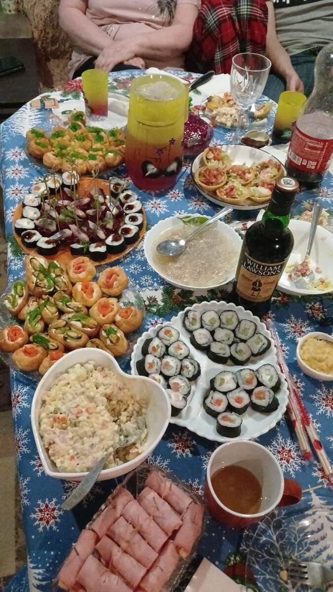 Всем огромный привет. Ну вот мы и встретили Новый год. Мечтала так много наготовить, но что то сил не хватило. Вот что было. Кстати ролы муж сам делал. Ну это ещё не весь стол захватила. Всех поздравляю. Желаю здоровья,мироного неба, вот знаете кроме Мирного неба ничего и не хочется, брат после полугода лечения опять поехал туда. Мальчишки. Ждём вас быстрее домой. Ну и всех знакомых поздравляю с наступившим. Мои роднули . Все не довольные, не любят фотографироваться. А раньше только скажи, улыбочку . И оооопа шикарный кадр. Растут. Характер. Люблю вас мои молявочки, здоровые ,вредные уже. Ещё раз всех бняла.
