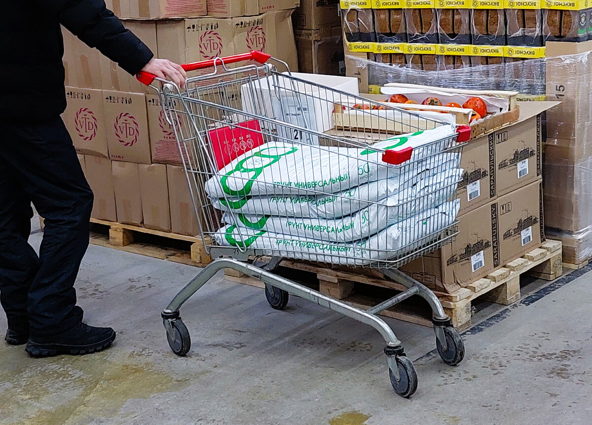 Покупатели наполняют свои тележки продуктами, самыми разнообразными. Это только начало заполнения, середина пути по магазину. В тележке, наверняка, будут и еще другие покупки, пока покупатель доедет с ней до кассы.