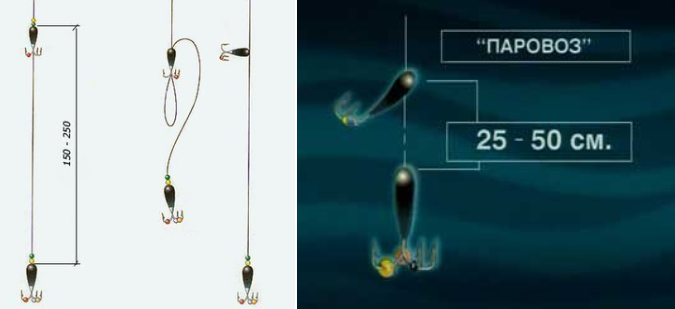 Для начала определим, что такое «паровоз». Часто говорят, что «паровоз» — это сочетание двух «чёртиков». Это действительно самый распространённый вариант. Однако, на мой взгляд, понятие «паровоз» гораздо шире. К нему можно отнести различные комбинации из нескольких приманок, привязанных друг к другу: «чёртик» — «чёртик», «чёртик» — мормышка, мормышка — мормышка и т. д. Я остановлюсь на наиболее распространённых и универсальных «паровозах». Основная причина уловистости «паровоза» заключается в том, что в работе находятся несколько приманок одновременно. Это, безусловно, как-то влияет на рыбу. Более точный ответ могли бы дать серьёзные научные исследования, но я попробую выделить несколько факторов, которые, на мой взгляд, делают «паровоз» привлекательным. Преимущества: Воздействие на хищнические инстинкты рыбы: «один убегает, другой догоняет». Тем более что хищнические наклонности и «дух соперничества» свойственны самым мирным рыбам. Возможность облавливать сразу несколько водных горизо