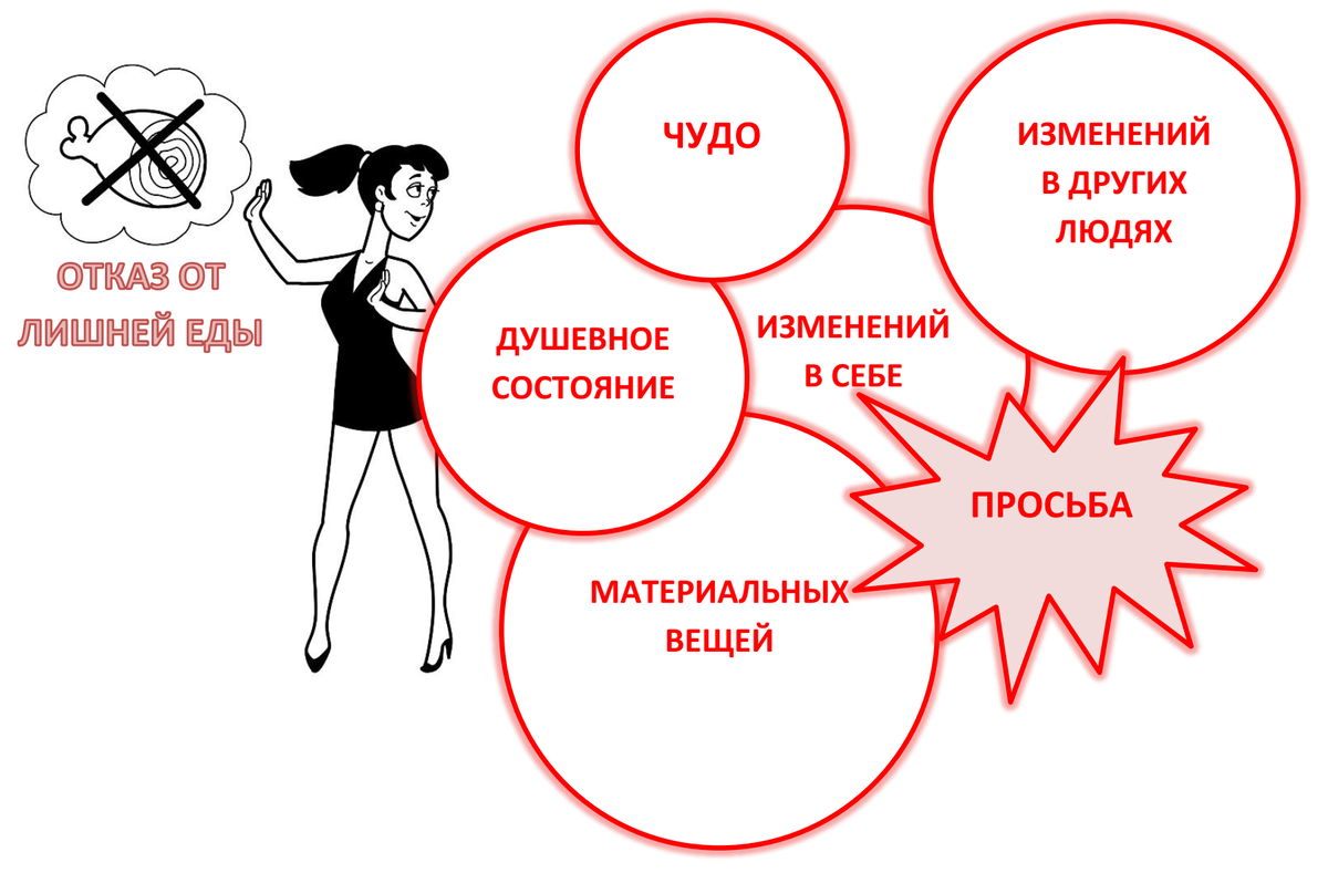 ПРОСИТЕ ИЗМЕНЕНИЙ В ДРУГИХ ЛЮДЯХ. Хотите, чтобы начальник начал замечать ваши заслуги? Хотите, чтобы муж бросил пить? Хотите, чтобы дочь захотела ребенка? Откажитесь от лишней еды ради того, чтобы другой человек изменился