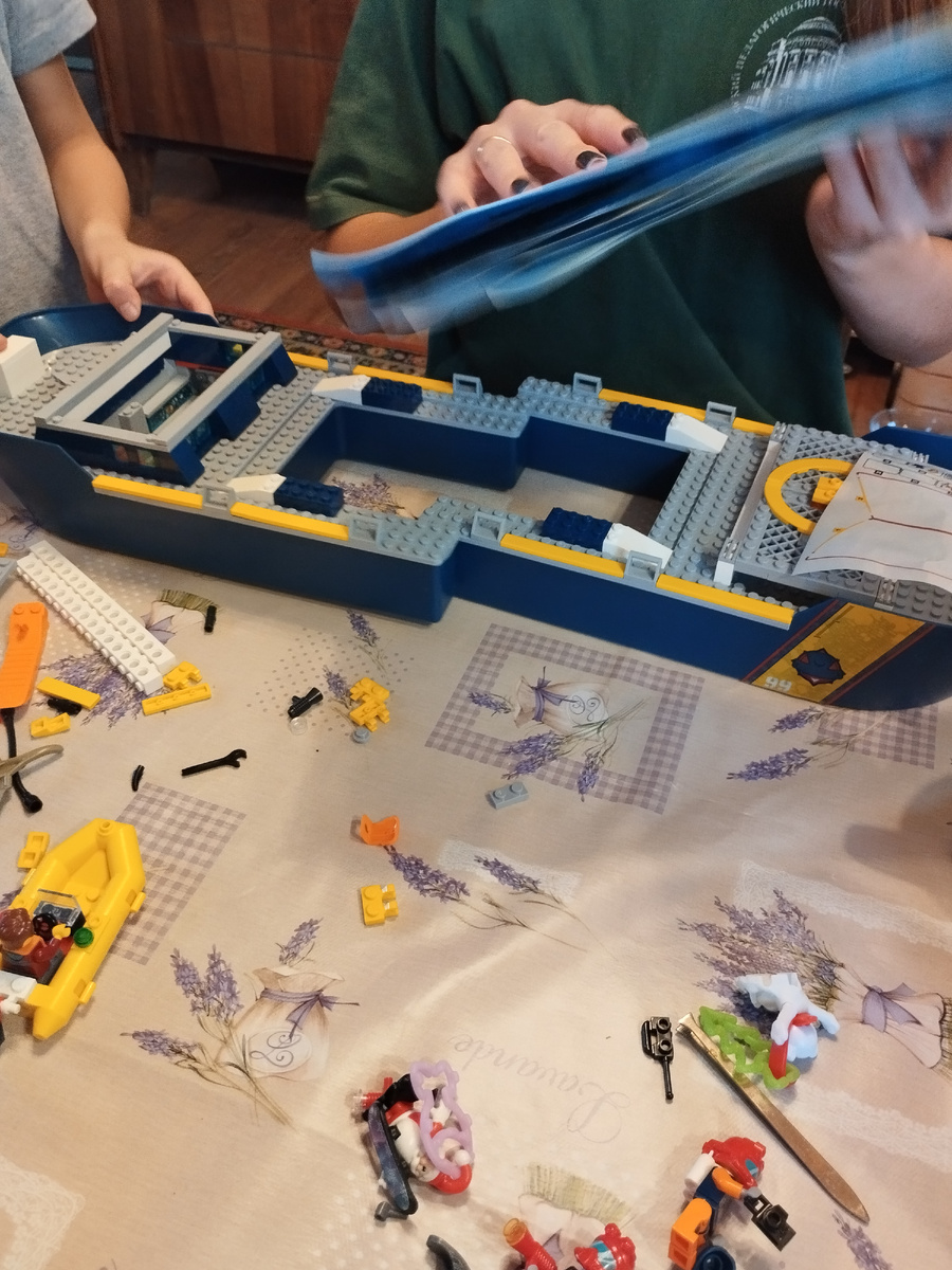 Мама с сыном собирают лего-корабль.