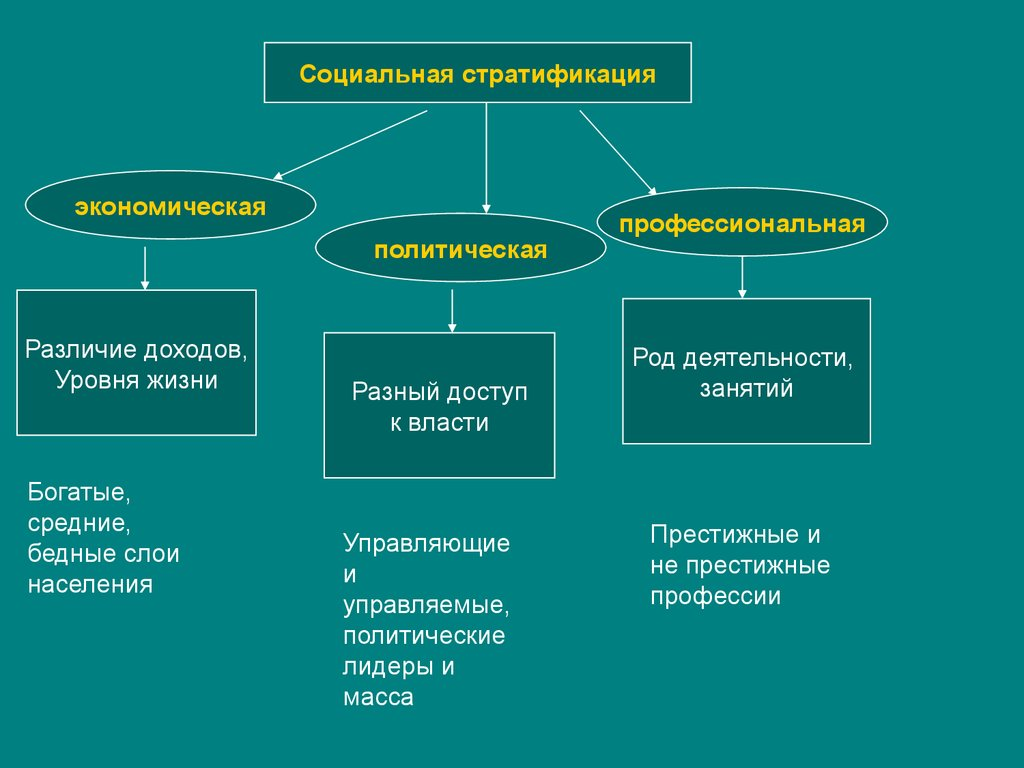- Экономическая стратификация (деление происходит из-за разных доходов и различающегося уровня жизни. Часто делят на богатых, бедных, нищих и так далее);