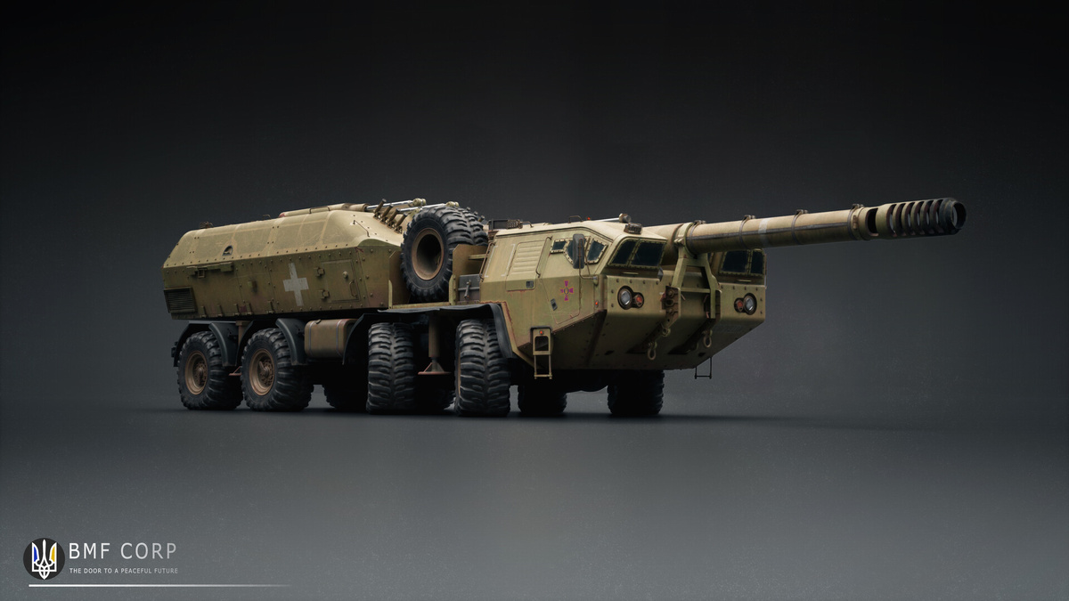 Поскольку украинский ВПК был уничтожен ещё задолго до начала украинских событий, никакой новой украинской боевой техники не было, а уж после уничтожения энергетики и остатков ВПК быть не может. Поэтому украинской 3D-моделистам остаётся только фантазировать на тему, если бы – да кабы. И как вы можете убедиться, достаточно успешно. Автор этой работы, наш украинский коллега, Denys Makedon, решил представить каким бы могло быть чудо-оружие Украинской армии, которое бы могло или остановить, или существенно замедлить русское наступление. Так как сегодня, наиболее удачным образцом техники в ВСУ является американская РСЗО HIMARS, он решил представить артиллерийский её аналог, как говорится мade in Ukraine. Таким оружием, по его мнению, могла бы стать сверхтяжёлая артиллерийская САУ на колёсной базе. В качестве артиллерийской установки для своей машины он выбрал 303 мм гаубицу. Как не трудно догадаться, абсолютно альтернативную. Что это за чудной калибр 303? Не спрашивайте, не знаю. Было бы лог