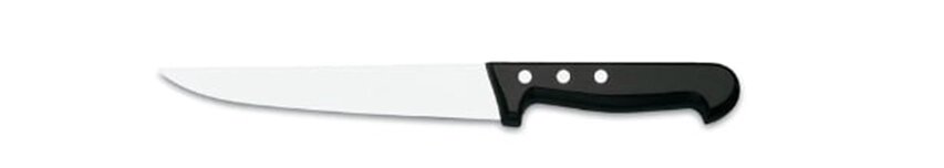 Чтобы подготовить хамон к нарезке, необходимо удалить слой сала и жёсткую шкуру. Для этого лучше всего подойдет нож с широким и негнущимся лезвием длиной 18–20 см. Этот нож должен быть прочным, ведь разрезание плотной кожи требует значительных усилий. Удобная ручка тоже играет важную роль, так как она поможет избежать усталости рук во время работы. Обвалочный нож