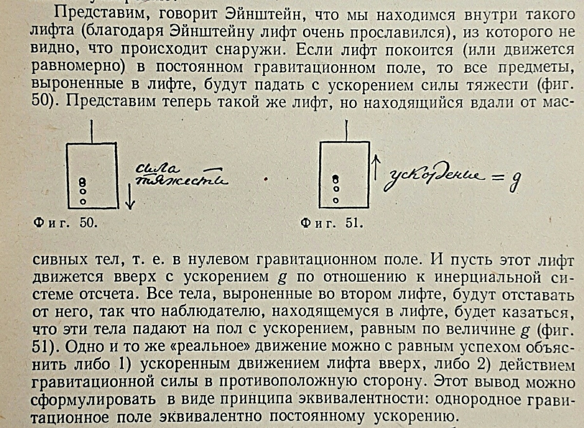 Обращаю внимание: Купер пишет что наблюдателю будет КАЗАТЬСЯ. То есть и Купер, как физик, и Эйнштейн понимали, что происходит на самом деле. Движется лифт, а не объект. Но в таком случае принцип эквивалентности относится только к иллюзии движения объекте в лифте двигающимся с ускорением в условиях отсутствия гравитационного поля. Но это означает, что никакого поля сил инерции нет. Рассмотрим "детские" примеры: