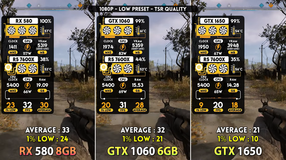 В одном из выпусков на YouTube-канале NJ Tech узнали, какую производительность в 1080p дают видеокарты RX 580, GTX 1060 и 1650. Игра S.T.A.L.K.E.R. 2 запускалась с низким пресетом, TSR Quality. Средняя частота кадров в ней равнялась 33 к/с (RX 580), 32 к/с (GTX 1060) и 21 к/с (GTX 1650). С FSR 3.1 средний FPS составлял 60, 54 и 7 к/с соответственно. Silent Hill 2 Remake тестировалась с графикой Low. В среднем здесь удалось получить 45 к/с (580), 46 к/с (1060) и 40 к/с (1650). God of War Ragnarök шла с пресетом Low, TAA Native. Средний FPS в этой игре равнялся 45 к/с (RX 580), 38 к/с (GTX 1060 и 1650). С FSR 3.1 Native, FG средняя производительность находилась на уровне 81, 70 и 57 к/с соответственно. В Black Myth: Wukong с пресетом Low, TSR Native средняя частота кадров находилась в районе 39 к/с (580), 34 к/с (1060) и 33 к/с (1650). Cyberpunk 2077: Phantom Liberty тестировалась со средними настройками графики. В ней средняя производительность равнялась 44 к/с (580), 40 к/с (1060) и 37