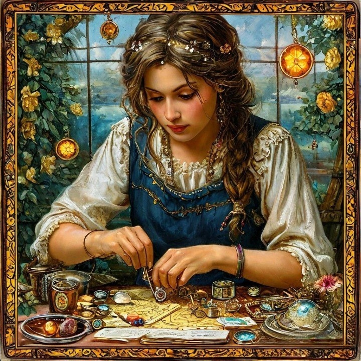 Привет! Я - Восьмёрка Пентаклей, и сегодня у меня очередной насыщенный день. Позвольте рассказать! Просыпаюсь ни свет, ни заря, как обычно. Что поделать - я трудоголик! Даже будильник не нужен, мой внутренний мастер уже зудит: "Вставай, дела ждут!" Чувствую себя бодро, хотя спина немного ноет от вчерашней работы над новым проектом. Завтракаю на бегу (знаю-знаю, вредно, но когда столько идей в голове...). Сегодня у меня особенный день - я наконец-то покажу боссу свой новый дизайн украшений. Три месяца училась у лучших ювелиров, ночами практиковалась, и теперь мои Пентакли сияют как никогда! По дороге на работу встречаю симпатичного парня из соседней мастерской. Он тоже ремесленник, делает потрясающие витражи. Уже неделю заглядывается на меня, но я так занята совершенствованием навыков, что едва нахожу время для разговоров. Хотя, признаюсь, его руки мастера меня очень впечатляют... Что можно ожидать от 8 Пентаклей в этот день, а также