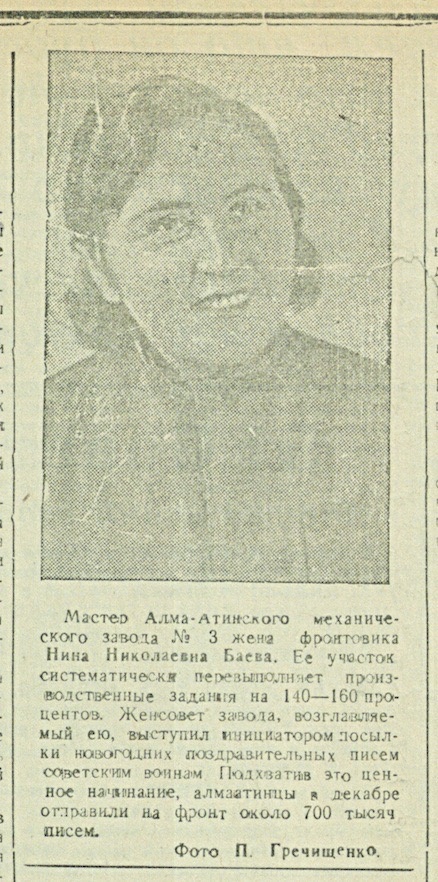«Мастер Алма-Атинского механического завода № 3, жена фронтовика Нина Николаевна Баева. Её участок систематически перевыполняет производственные задания на 140-160 процентов. Женсовет завода, возглавляемый ею, выступил инициатором посылки новогодних поздравительных писем советским воинам. Подхватив это ценное начинание, алматинцы в декабре отправили на фронт около 700 тысяч писем».
