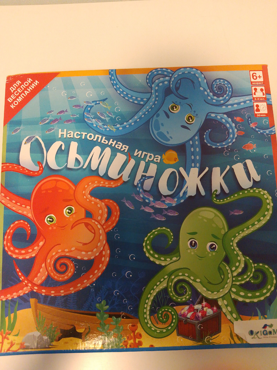 Вчера ездили к родным в другой город поздравлять с новым годом. Условились не дарить ничего взрослым, но малышам всё таки решили что-то небольшое положить под ёлочку. Вот нашему сыну досталась настольная игра. У нас такой ещё не было. Правила интересные. Нужно считать и размышлять логически. Поле из плотного картона сделано в виде пазла. Карточки- жетоны тоже плотные. Думаю, на долго хватит. Игра про осьминогов, которым нужно найти сокровища в сундуках. Правда иногда в сундуке попадаются консервные банки или морские Ежи. Чтобы сокровища найти, осьминожкам нужно вырастить свои щупальца и дотянутся до сундуков. Есть жетоны - которые дают минус очки. А иногда даже можно подкидывать противнику любой жетон, даже с минусом, ну или с плюсом тоже не плохо. Мне было жалко в процессе игры давать сыну ( противнику) плохие жетоны. Но, иногда, других жетонов просто не остаётся и приходится их класть на поле противника. Выигрывает тот, кто наберёт больше очков. Причём, очки нужно считать и