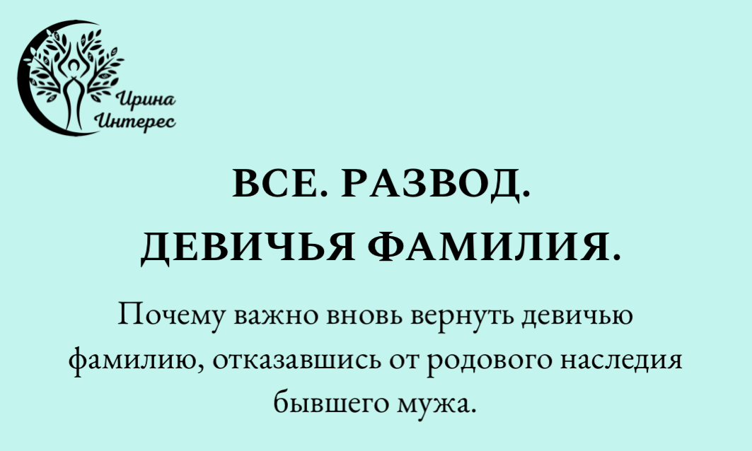 Добрый день, уважаемые подписчики! Часто сталкиваюсь с таким вопросом на личных консультациях: «Ирина, мы с мужем в разводе, 2-е общих детей, алименты платит, отношения сохранились хорошие. И вот вопрос про фамилию мужа. Говорят , что после развода по энергиям необходимо вновь возвращать девичью фамилию для устройства личной жизни, но это такая бумажная волокита и в дальнейшем разная фамилия с детьми. Как поступать? Что делать?» или «Я молода и овдовела, он погиб. Хочу просто память о нем сохранить, его фамилию носить». Я, конечно, максимально за простоту и ясность жизни без лишней бумажной бюрократии. Но если смотреть правде в глаза , то лучше вернуть фамилию девичью. Причина тому проста: необходимо на уровне энергетического /ментального/эмоционального плана вернуть себе защиту главного мужчины рода. Когда женщина незамужняя - она под защитой своего отца. И здесь не имеет значение жив он или нет на данный момент, знали вы его или нет, принимал ли он активное участие в воспитании