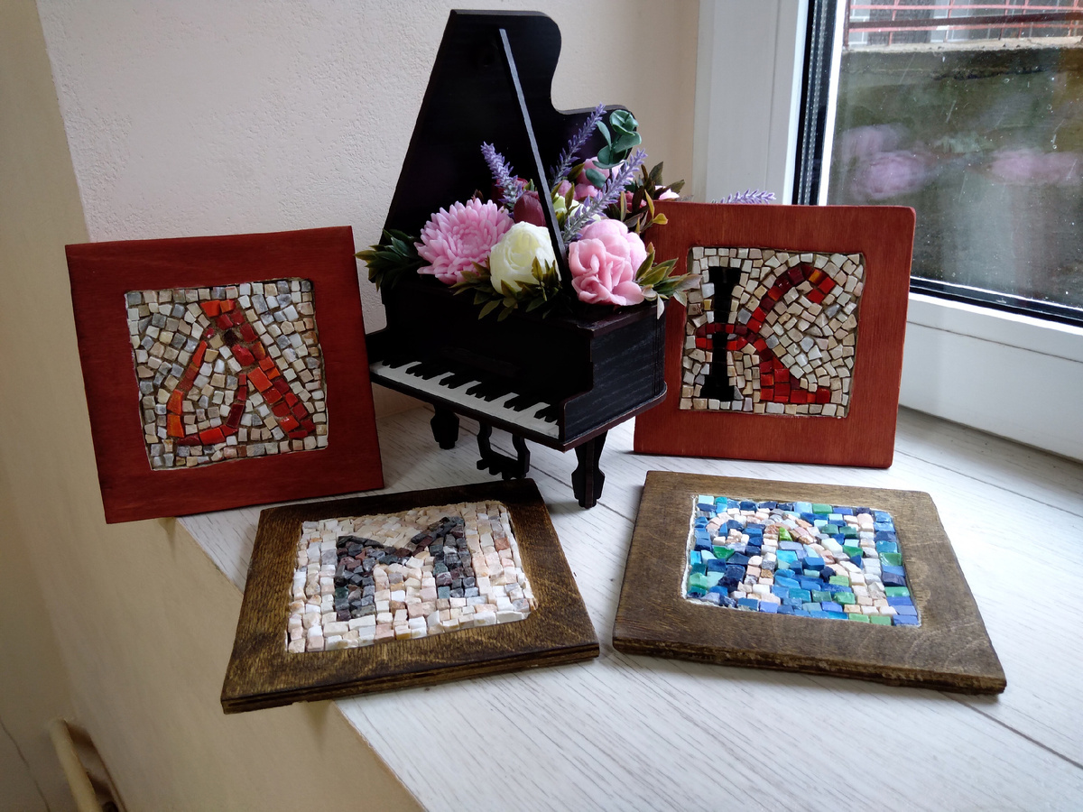 Мозаичные монограммы в Арт-студии "Камертон". Монограмма "К". Техника: мозаика, обратный набор. Материалы: натуральный мрамор, смальта. Размер: 10х10 см. Автор: Евгения Кислухина. Преподаватель: Артём Скурихин. Монограмма "А". Техника: мозаика, обратный набор. Материалы: натуральный мрамор, смальта. Размер: 10х10 см. Автор: Сусанна Стародубова. Преподаватель: Артём Скурихин. Монограмма "М". Техника: мозаика, обратный набор. Материалы: натуральный мрамор, смальта. Размер: 10х10 см. Автор: Полина Мошкина. Преподаватель: Артём Скурихин. Монограмма "N". Техника: мозаика, обратный набор. Материалы: натуральный мрамор, смальта. Размер: 10х10 см. Автор: Ирина Коткова. Преподаватель: Артём Скурихин. Арт-студия "Камертон". г. Гатчина, Ленинградская обл., ул. Карла Маркса, д. 36А.