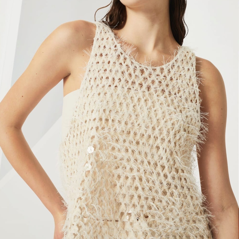 Легкий и воздушный топ из трикотажа Dazzling Mosaic Embroidery демонстрирует классическую сетчатую вязку с утонченной вышивкой. Модель отличается геометрической сетчатой вязкой нитей с очень широкими петлями. На них расположены макропайетки шестиугольной формы, создающие эффект мозаики и украшающие поверхность нежными отблесками. Пайетки зафиксированы с пушистыми завитками хлопка, образуя воздушный и невесомый эффект.