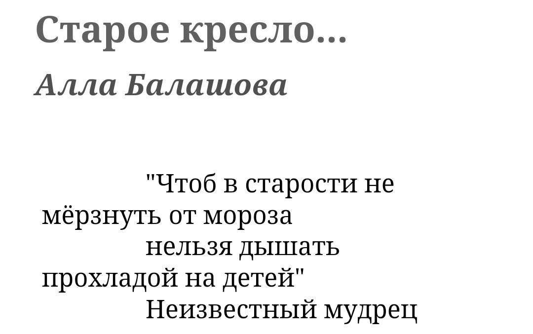 Степан не спал всю ночь, а утром выйдя в коридор, сел в старое, нелепое кресло, погладил его и промолвил: "Не волнуйся, я почищу тебя, укрою пушистым пледом и ты будешь самым дорогим мне оберегом, напоминающим о лучших годах моей жизни, о любимых людях, которые подарили мне своё сердце".