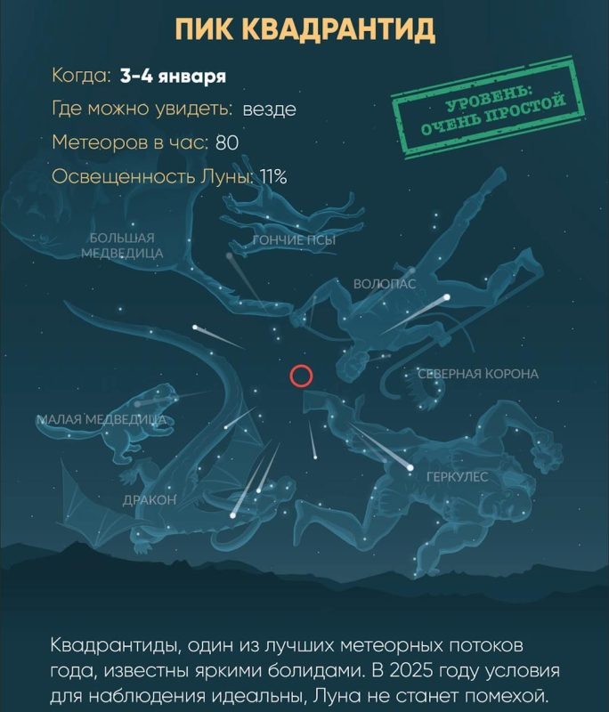В Оренбургской области ночное небо будут озарять 80 до 110 метеоров в час, сообщает ТГ-канал «Ближний космос». Пик метеорного потока Квадрантиды — одного из самых ярких потоков года, ожидается сегодня ночью, с 3 на 4 января. Метеорный поток будет более интенсивным, чем знаменитые Персеиды в августе. Метеорный поток Квадрантиды получил свое название от созвездия Стенной Квадрант, которое уже не используется современными астрономами. В настоящее время радиант потока находится под ручкой ковша Большой Медведицы в созвездии Волопас. Поток должен быть виден на всей территории России. Авторы ТГ-канала «Ближний космос» дали рекомендации по наблюдению метеорного потока: — Найдите место подальше от городских огней.
