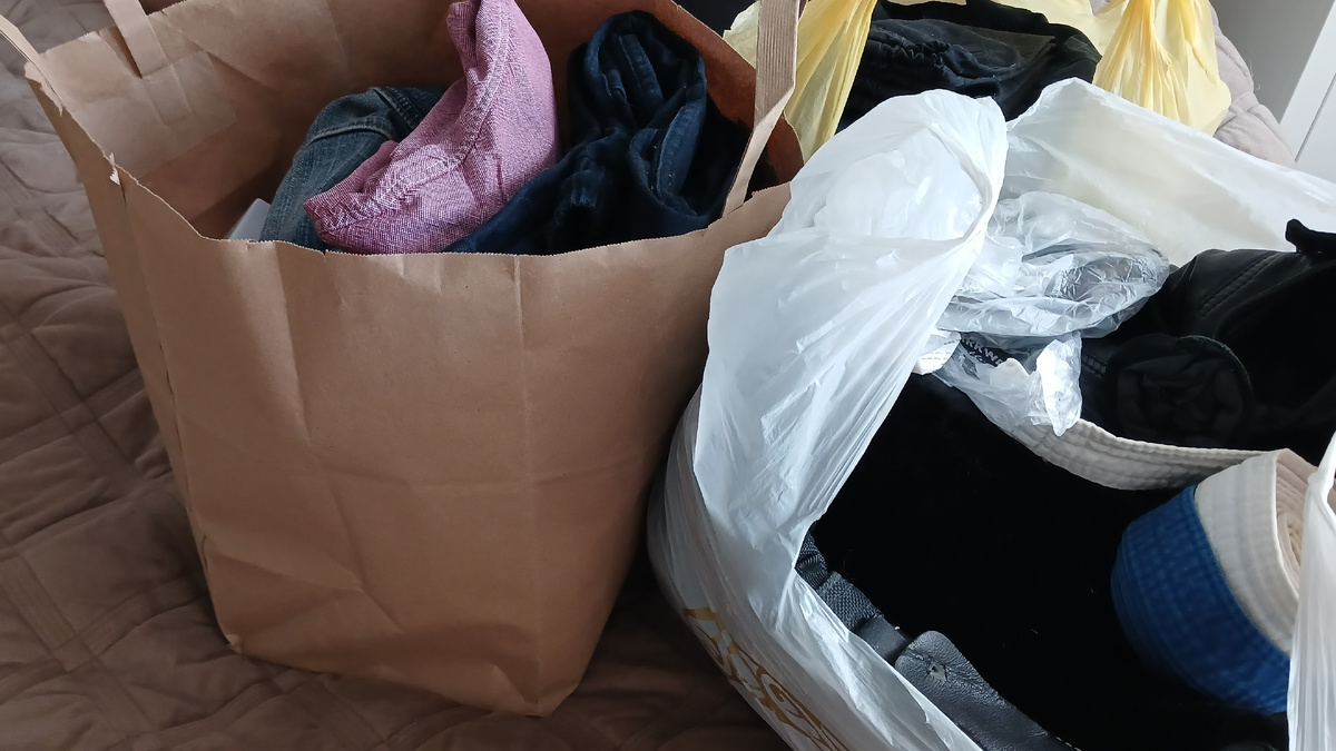 У меня продолжается расхламление. И вас я тоже продолжаю вдохновлять на разбор шкафов и избавление от ненужного, лишнего, от того, чем давно не пользуетесь. 🤩 Все, что мы отобрали вчера на отдать-продать-выбросить в шкафу сына перебрала еще раз и сгруппировала по пакетам. Плюс были пакеты с вещами, которые я ранее разбирала. Один пакет отнесу в экобокс, у нас есть неподалеку. Сдам туда вещи. Второй пакет -полотенца старые и старое покрывало с кровати сына, а также 2 пододеяльника и 2 наволочки. Это хочу передать в приют вместе с миской. Тут у нас 31 декабря один пододеяльник приказал долго жить. Достала из стирки, а он уже того...Так что тоже отправится к собачкам в приют. Третий и четвертый пакеты битком (на фото на переднем плане) - это вещи, которые нужно отвезти на барахолку Чумодан. С их продажей не хочу заморачиваться, проще отдать так. Присоединила к ним еще несколько мелочей из тех, что провисели год на авито и не продались. Добавила свое джинсовое платье и старую джинсовую