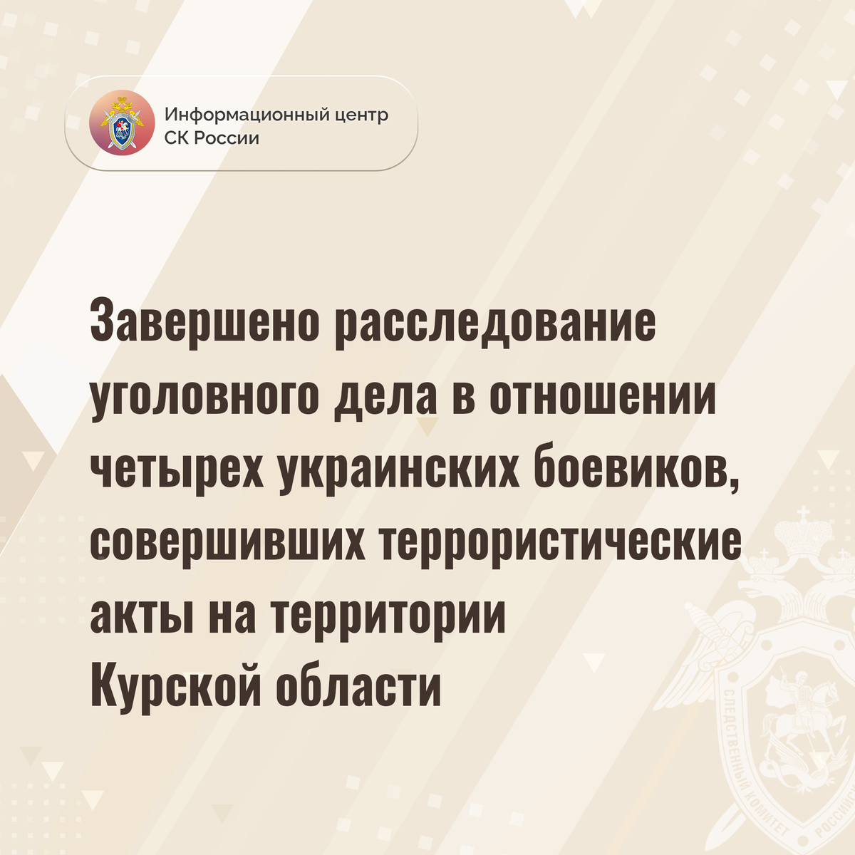 Следственным комитетом России завершено расследование уголовного дела в отношении военнослужащих 11-го отдельного батальона 22-й отдельной механизированной бригады вооруженных формирований Украины: Валерия Мальченко, Сергея Боченко, Сергея Литвиненко и Сергея Биличенко. Каждый из них обвиняется в совершении террористических актов на территории Курской области (п.п. «а», «в» ч. 2 ст. 205 УК РФ).