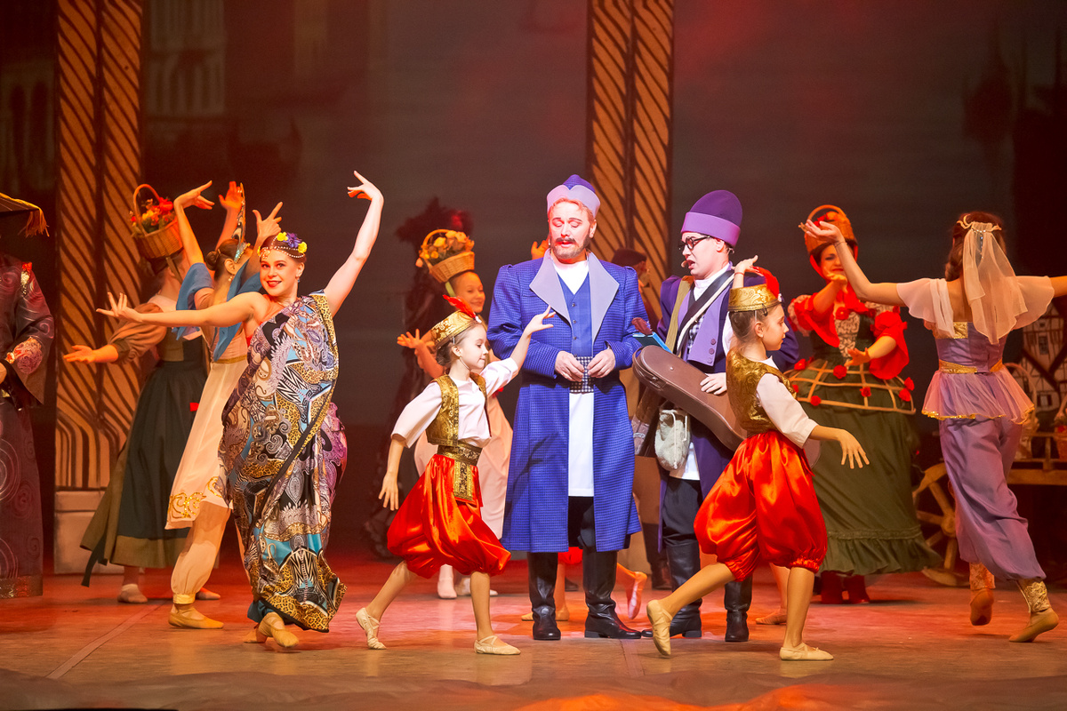 В музыкальном театре к новогодним утренникам поставили «Аленький цветочек» (6+). Конечно, не балет, а мюзикл в режиссуре Александра Брауна. Тем не менее театр взялся за дело с размахом, и в качестве художника-постановщика пригласил Екатерину Малинину из Мариинки. Результат не заставил себя ждать – «имперская» роскошь чувствуется во всём: в удивительной красоты суперзанавесе, на котором горит алый цветок, в обилии самых разнообразных костюмов, в визуальных эффектах. И если добавить сюда достаточно неплохую игру актёров, впечатляющую хореографическую массовку и, конечно же, выразительную музыку Максима Дунаевского, то понятно, что спектакль может рассчитывать не на неделю праздников, а на долгую сценическую жизнь.