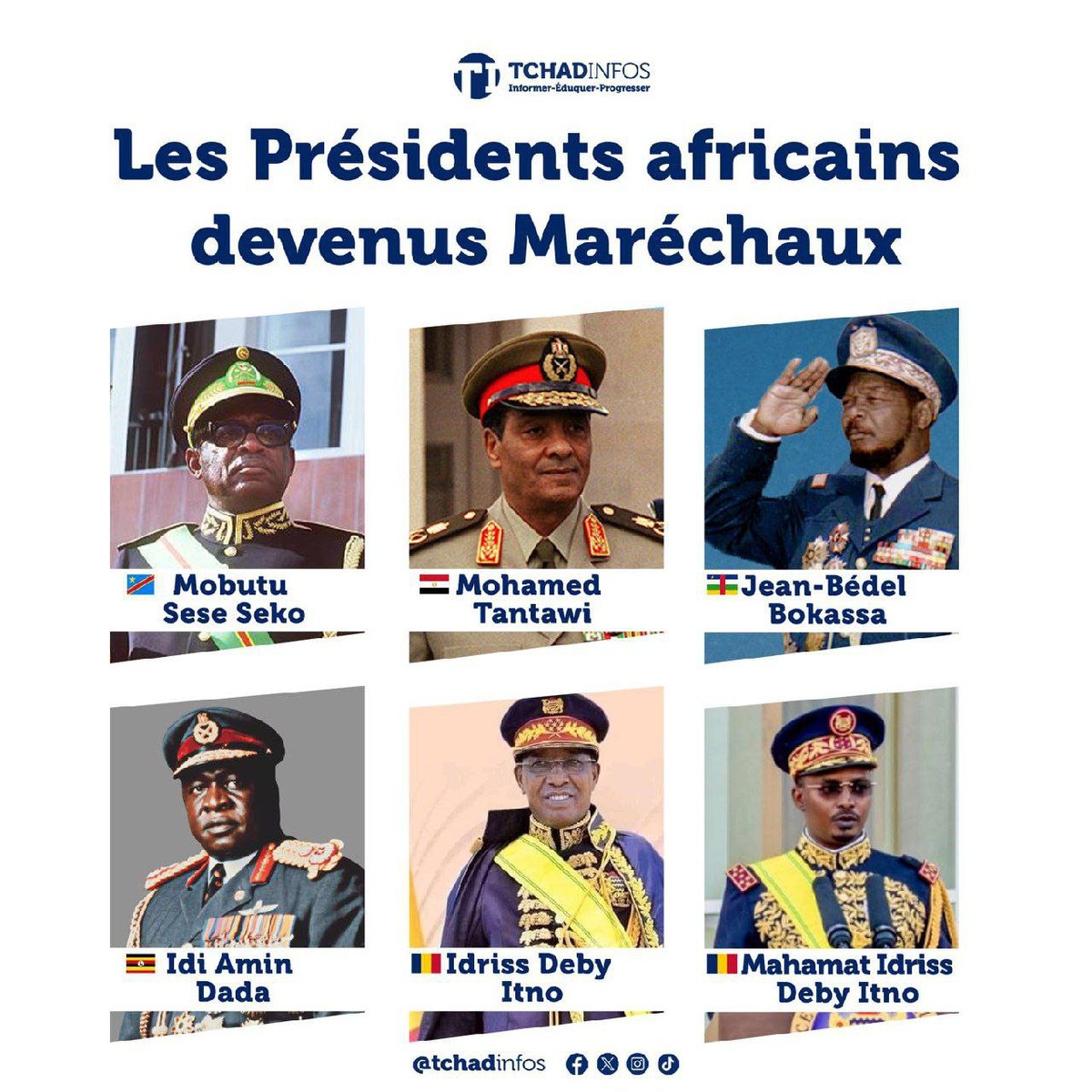 Всего шесть африканских президентов получили высшее военное звание - Маршал. Отмечают в социальных сетях. Среди них, последнее звание, и в самом молодом возрасте получил Махамат Деби. Компанию ему составили весьма интересные и достойные личности, помимо его отца 😅 Подписывайтесь на наш телеграмм канал ❤️https://t.me/afric_ylbIbka #ирония #чад