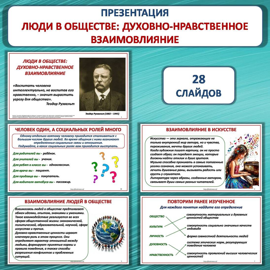Презентация «Люди в обществе: духовно-нравственное взаимовлияние» разработана к уроку ОДНКНР в 6 классе в соответствии с ФОП. Презентацию можно использовать как отдельно, так и в комплекте с рабочим листом (ссылка дана ниже) Презентация состоит из 28 слайдов. Слайды № 2, 10, 12, 13, 16, 23 анимированы, чтобы у учителя была возможность организовать беседу или дискуссию на уроке. По щелчку появляются ответы. Презентацию скачать здесь Слайд № 1. Титульный слайд. Высказывание Теодора Рузвельта «Воспитать человека интеллектуально, не воспитав его нравственно, – значит вырастить угрозу для общества». Слайд № 2. Повторим ранее изученное (общество, культура, личность, духовность, нравственность) Слайд № 3. Взаимовлияние людей в обществе. Слайд № 4. Взаимовлияние в искусстве. Слайд № 5. Взаимовлияние в науке. Слайд № 6. Взаимовлияние в экономике. Слайд № 7. Взаимовлияние в образовании. Слайд № 8. Взаимовлияние в религии. Слайд № 9. Социальные отношения. Слайд № 10. Человек один, а социальных р