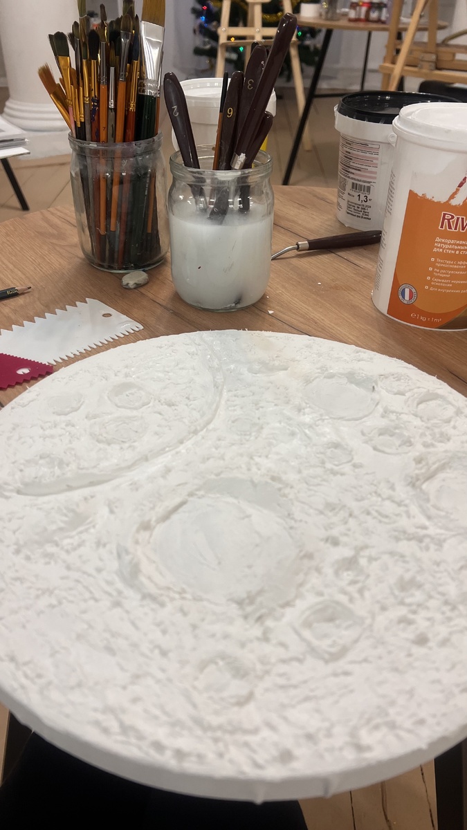 Накануне Нового года я решила создать нечто необычное — символичную Луну, которая бы передала ощущение волшебства и загадочности предновогоднего времени. Этот проект состоял из двух этапов: создание рельефа и раскрашивание. Первый шаг: текстурная основа На первой фотографии вы видите заготовку Луны, сделанную из специальной структурной пасты. Я нанесла текстуру, чтобы создать эффект кратеров и сделать её максимально реалистичной. Это напоминало мне об исследовании чего-то неизведанного, словно прикосновение к другой планете. Оранжевая мандаринка рядом — символ праздника, который вдохновляет на творчество и создает уютную атмосферу. Второй шаг: раскрашивание Раскрашивала Луну я 30-го декабря, На фотографии можно увидеть, как благодаря черной и серебристой краске оживают её детали, а кратеры начинают играть тенями. Это занятие принесло мне огромное удовольствие, особенно под звуки новогодней музыки и аромат свежих мандаринов. Для меня творчество — это способ передать своё настро
