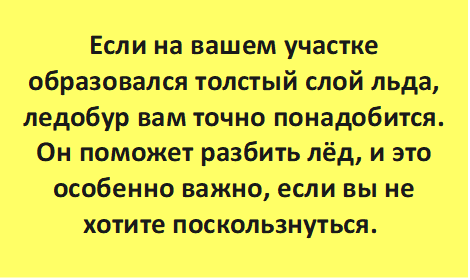 А вот если на вашем участке образовался толстый слой льда, ледобур вам точно понадобится. Он поможет разбить лёд, и это особенно важно, если вы не хотите поскользнуться. Выход из дома можно сделать менее сложным, если у вас есть правильный инструмент!