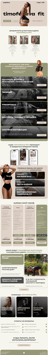 2024 год заканчивался довольно интересно. Мне нужно было до конца декабря сдать лендинг на Тильде для запуска потока фитнес тренеру Анастасии. Анастасия прислала желаемую цветовую гамму, прислала пример стиля в каком она хочет дизайн и ТЗ с текстовкой по блокам. Из-за того что я приболела перед самым Новым годом я думала, что не успею 😐 Выпила лекарства, взяла себя в руки и поехали... Всё успела. Отлежалась потом 1, 2 и 3 января 😃 С Анастасией сотрудничаем не один год, это как минимум 4 или 5 наверное лендинг для нее, если я ничего не путаю. Лендинг выполнен преимущественно на зероблоках, стандартный блок только с вопрос-ответами)) Галерея работает за счёт скрипта, именно такой галереи в стандартных блоках нет. Видео встроены через Кинескоп.