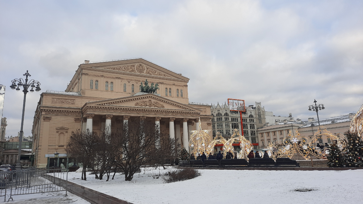 Вот Большой театр. Перед ним красивостей много. ПРи желании можно шикарную фотосессию устроить. У меня желания не было, так что просто для вас сделала кино и пофотографировала. Шарики-фонарики не отключили с рассветом, так что красоты чуть больше.