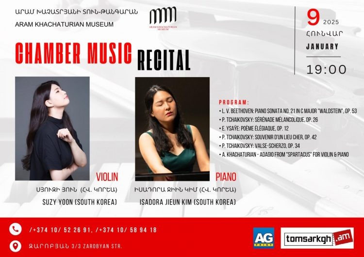 В концертном зале Дома-музея Арама Хачатуряна (Ереван, ул. Заробяна, 3) 9 января пройдет концерт лауреатов международных конкурсов Сюзи Юнь (скрипка, Южная Корея) и Исадоры Джиин Ким (фортепиано, Южная Корея). В программе – Бетховен (соната для фортепиано №21 in C major «Waldstein», Op. 53); Чайковский (серенада, Op. 26); Эжен Изаи (элегическая поэма, Op. 12); Чайковский («Воспоминание о дорогом месте», Op. 42); Чайковский (вальс-скерцо, Op. 34); Арам Хачатурян (адажио из балета «Спартак» для скрипки и фортепиано). Начало концерта в 19:00, стоимость билета – 3000 драмов (можно купить по ссылке https://www.tomsarkgh.am/hy/event/46502/). Билеты можно также приобрести в кассе музея или забронировать по номерам телефонов +374 10/ 52 26 91, /+374 10/ 58 94 18.